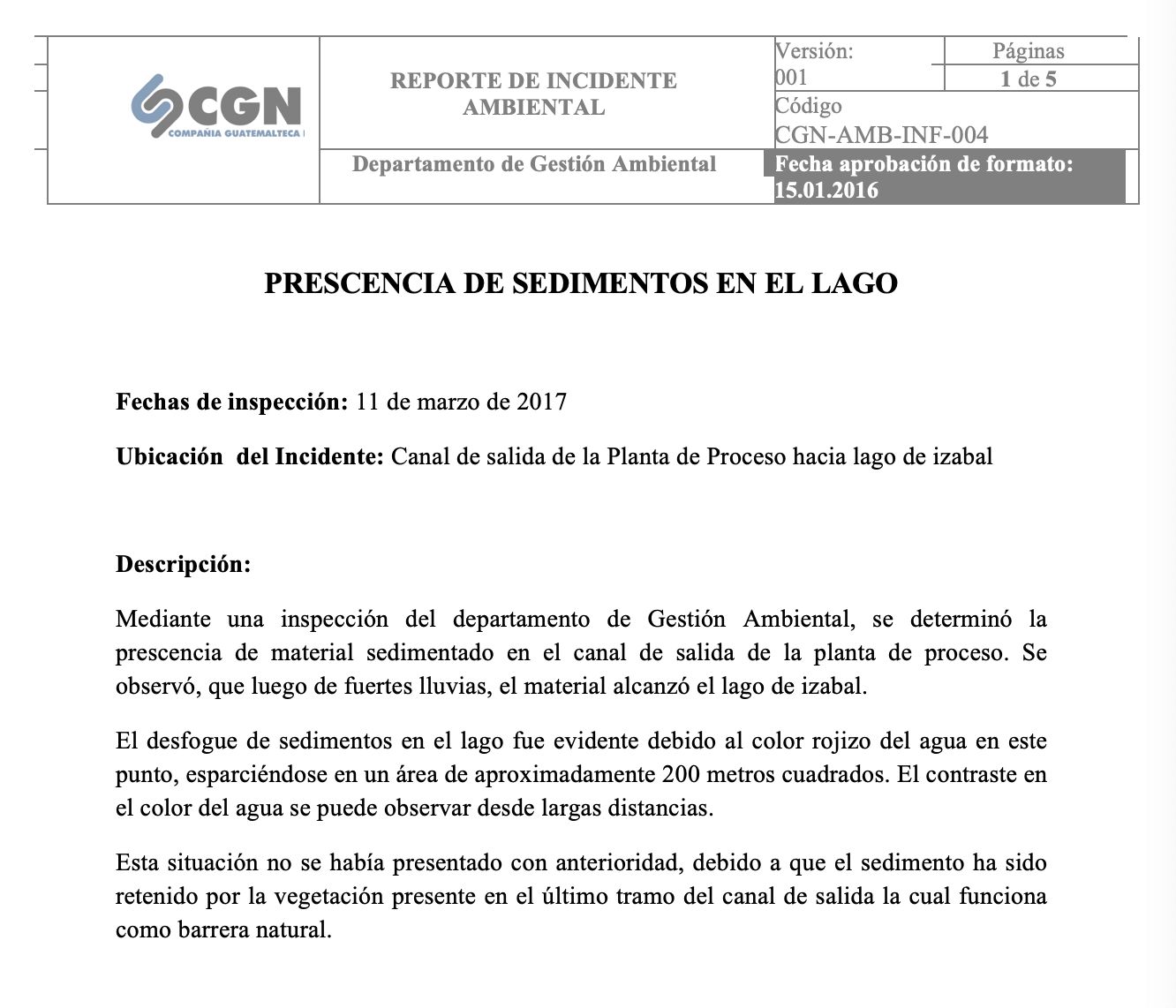 Un documento fechado 11 de marzo de 2017 llamado “Reporte de Incidente Ambiental” redactado por el Departamento de Gestión Ambiental de CGN, indica que en el canal de salida de la planta de proceso hacia el lago de Izabal “se determinó la presencia de material sedimentado… se observó, que luego de fuertes lluvias, el material alcanzó el lago de Izabal”.